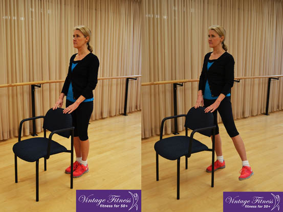 This is a yoga pose that has been modified by adding a chair in front for extra balance support. Make sure that you take a big enough step forward so that your front foot lines up over your ankle.